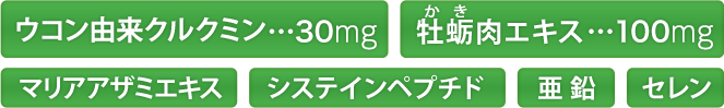 薑黃來源的薑黃素:30mg、牡蠣肉萃取物:100mg、水飛薊萃取物:323mg(水飛薊素:210mg)、半胱胺酸勝肽:8mg、鋅:6mg、硒:12μg