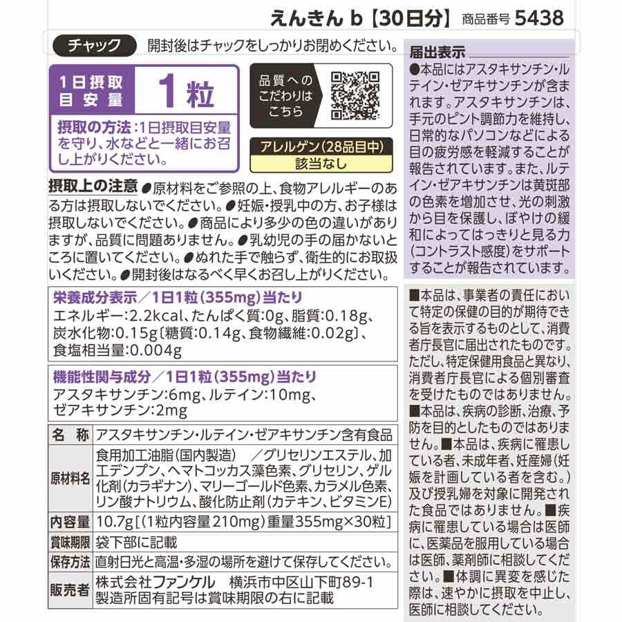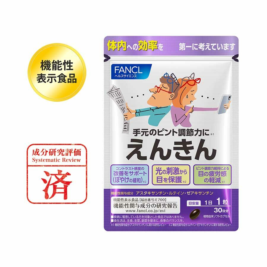 「Enkin」是一種功能性食品,含有FANCL精心挑選的三種成分的複雜組合:蝦青素、葉黃素和玉米黃質。