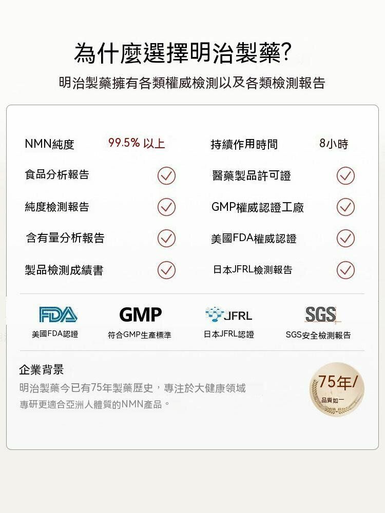 明治製藥NMN不含任何激素、抗生素及防腐劑,能有效迅速進入血液,容易被身體器官吸收並轉化為NAD+,日本華盛頓大學教授金井真一廊證實服用口服NMN可以使NAD+量於人體內明顯提高,啟動DNA修複功能成功修復體內細胞及再生使提高體力和學力,有效抑制衰老現象,令身體機能年輕化、抗衰逆齡20年。