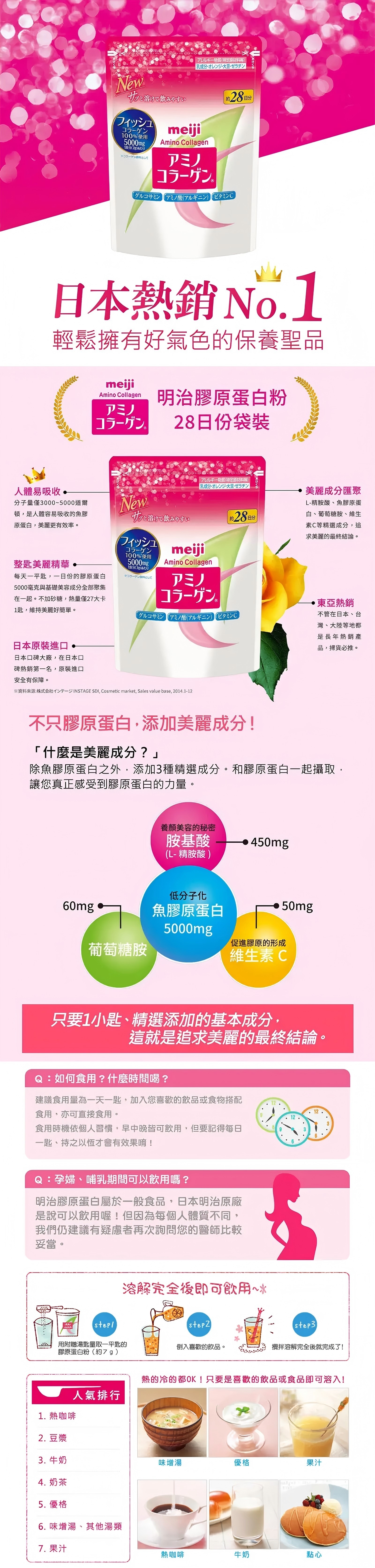 明治膠原蛋白粉抽取最優質之深海魚類提煉而成,低卡路里,而且對不含人造及基因改造成份。其膠原份子經先進技術處理,分子體積比其他同類產品更精緻微細,更易被身體及皮膚吸收。除骨膠原外,亦特別加入Vitamin C,Arginine,Glucosamine三種成份,以助提升肌膚之整體活力.