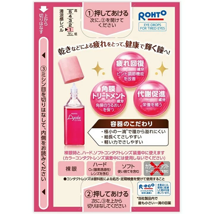 全新推出的Lycee Glow抗疲勞眼藥水,是一款裸眼、隱形眼鏡皆可使用的抗疲勞眼藥水。其中含有的營養成分維他命B12、角膜修護成分硫酸軟骨素鈉、舒緩睫狀肌疲勞的新斯的明、促進細胞新陳代謝的維他命B6等所有有效成分,均為行業基準內最高濃度*1。 特殊的極細瓶嘴設計,每次只滴出”“極小一滴”*2,防止一次擠出的藥液太多導致眼妝花妝。細長瓶身,適合放在化妝包裡隨身攜帶。