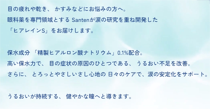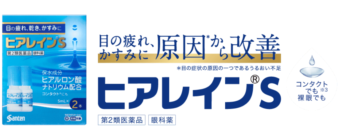Hyalein S滴眼液,可适用于因泪水不稳定等引起的“视疲劳”“眼睛干涩”“视力模糊”等症状。