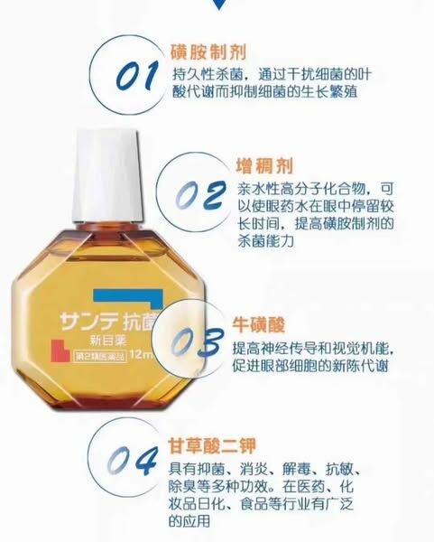 功能:一種長效磺胺藥,對結膜炎和麥粒腫的致病菌具有抗菌作用。