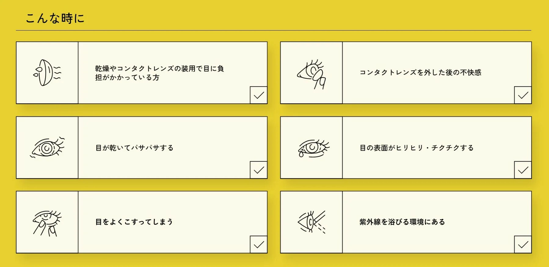 預防由紫外線等光線引起的眼部炎症(如雪盲等)、眼疲勞、結膜充血、視線模糊(結膜分泌物過多時等)、眼睛搔癢、眼科疾病(如遊泳後,灰塵、汗水進入眼睛時等情況)、眼瞼炎(眼瞼接觸性皮炎)以及配戴硬性隱形眼鏡時的不適感
