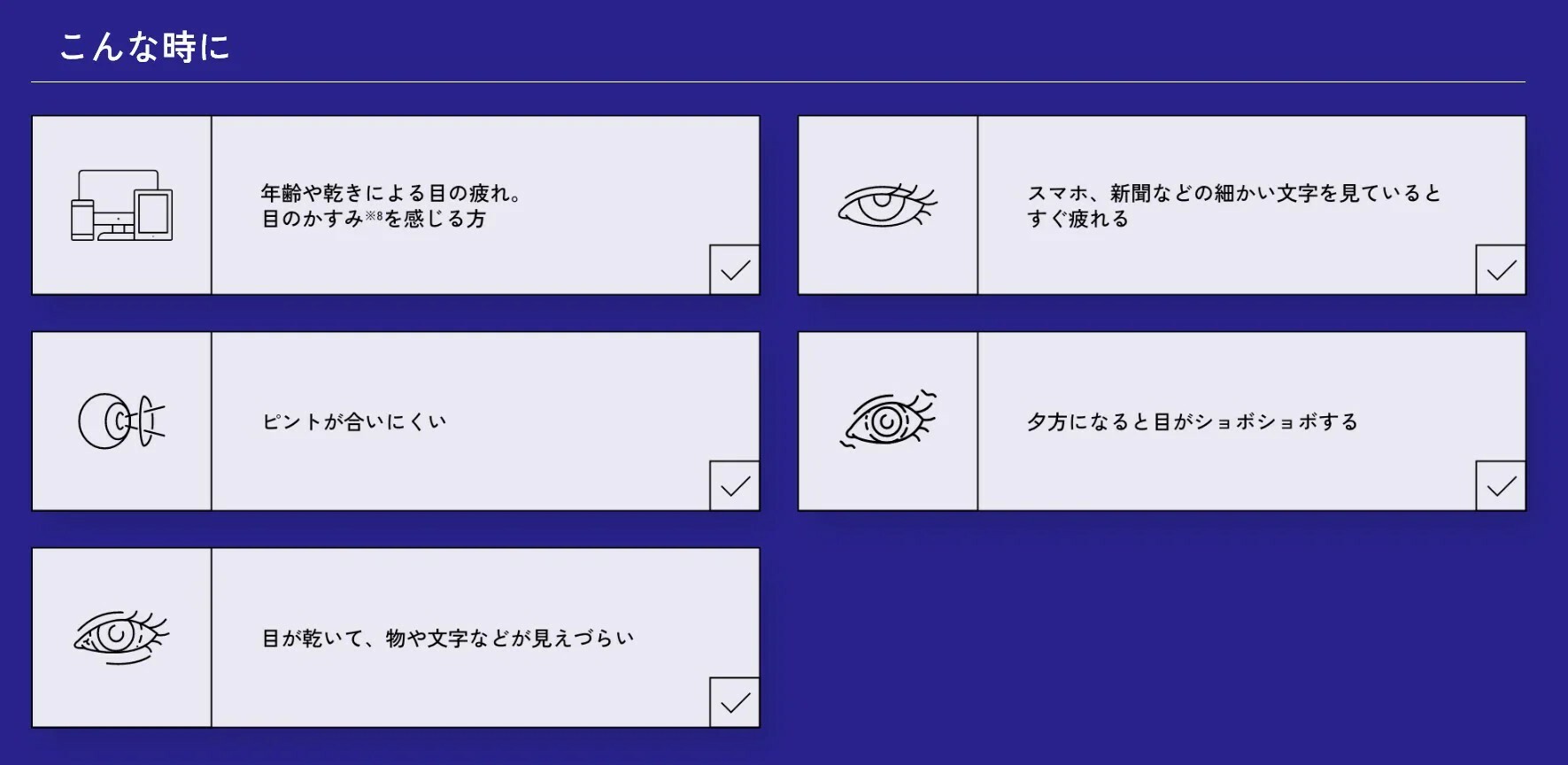 預防視線模糊(結膜分泌物過多時等)、眼疲勞、結膜充血、眼睛搔癢、眼科疾病(如遊泳後,灰塵、汗水進入眼睛時等情況)、由紫外線等光線引起的眼部炎症(如雪盲等)、眼瞼炎(眼瞼接觸性皮炎)以及配戴硬性隱形眼鏡時的不適感
