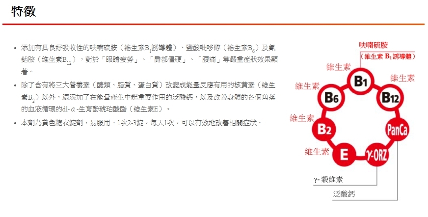 除了抗疲勞成分“fursultiamine”外,它還含有參與維持神經功能的維生素 B 6和 B 12 。它適用於眼睛疲勞、肩膀僵硬和背部疼痛。