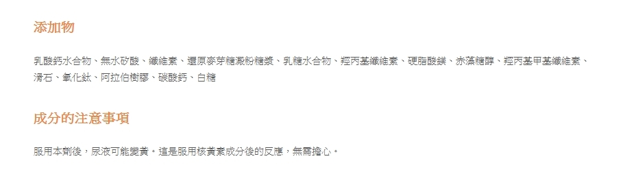 添加劑乳酸鈣水合物,矽酸酐,月桂糖,還原的麥芽糖水糖果,乳糖水合物,羥丙基纖維素,鎂酸鎂,赤蘚糖醇,羥丙甲纖維素,滑石粉,氧化鈦,阿拉伯膠,碳酸鈣,蔗糖