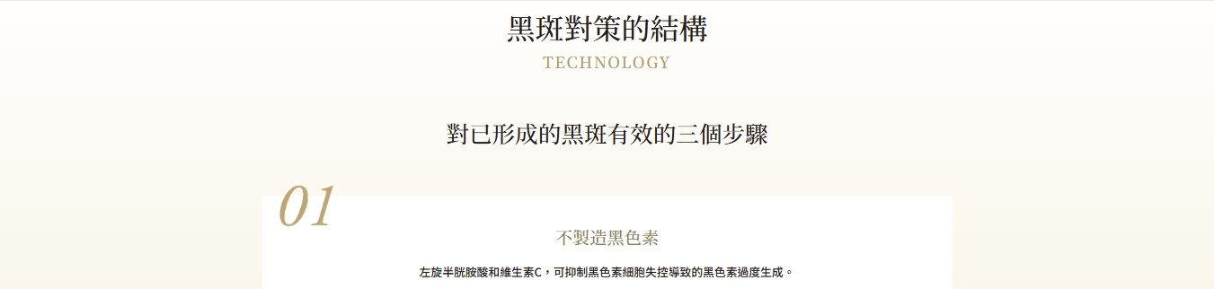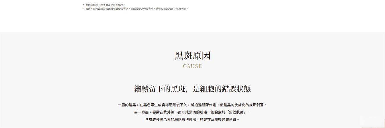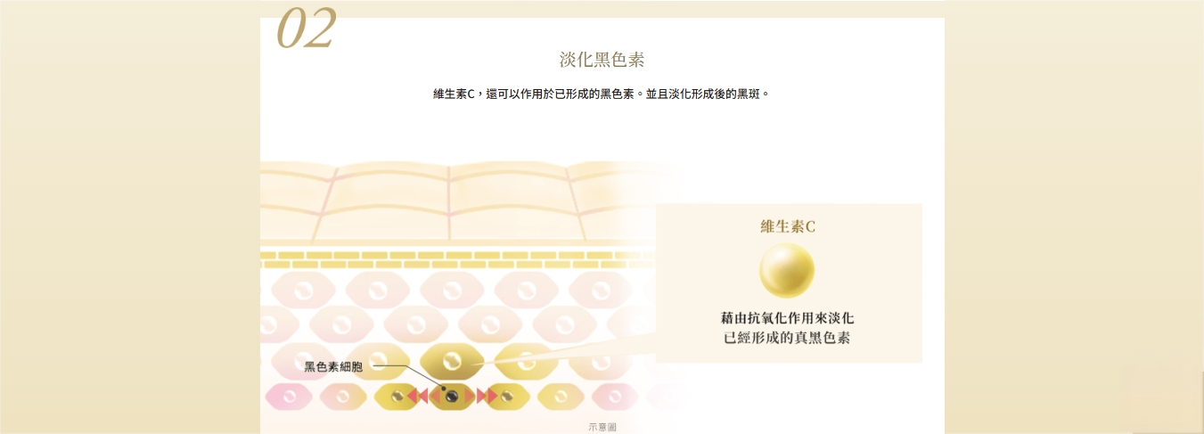 維他命C配方(含L-半胱氨酸) 老年斑、雀斑、曬傷等引起的色素沉著是由於老化或暴露於紫外線導致黑色素過度增加而引起的。