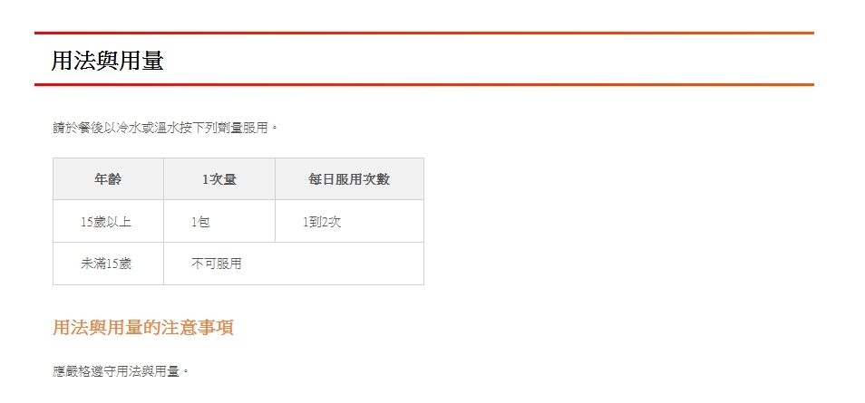 成人(15歲以上):1次1包,每天服用的次數一次或兩次