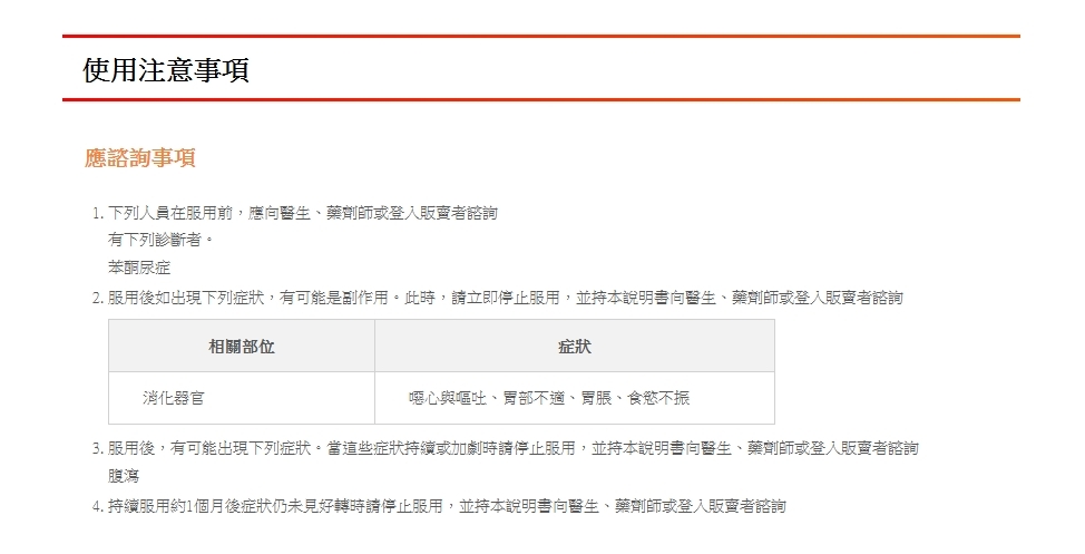 如服用後持續產生以下症狀,請立即停止服用,並攜帶該藥品徵詢醫師、藥師意見