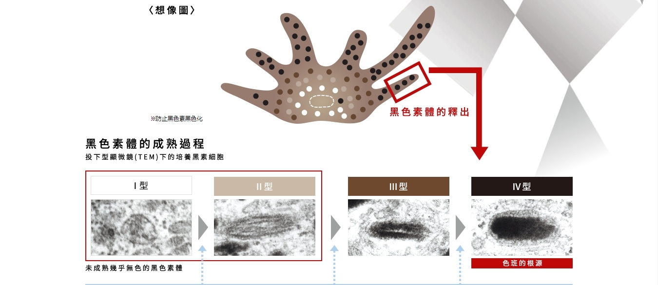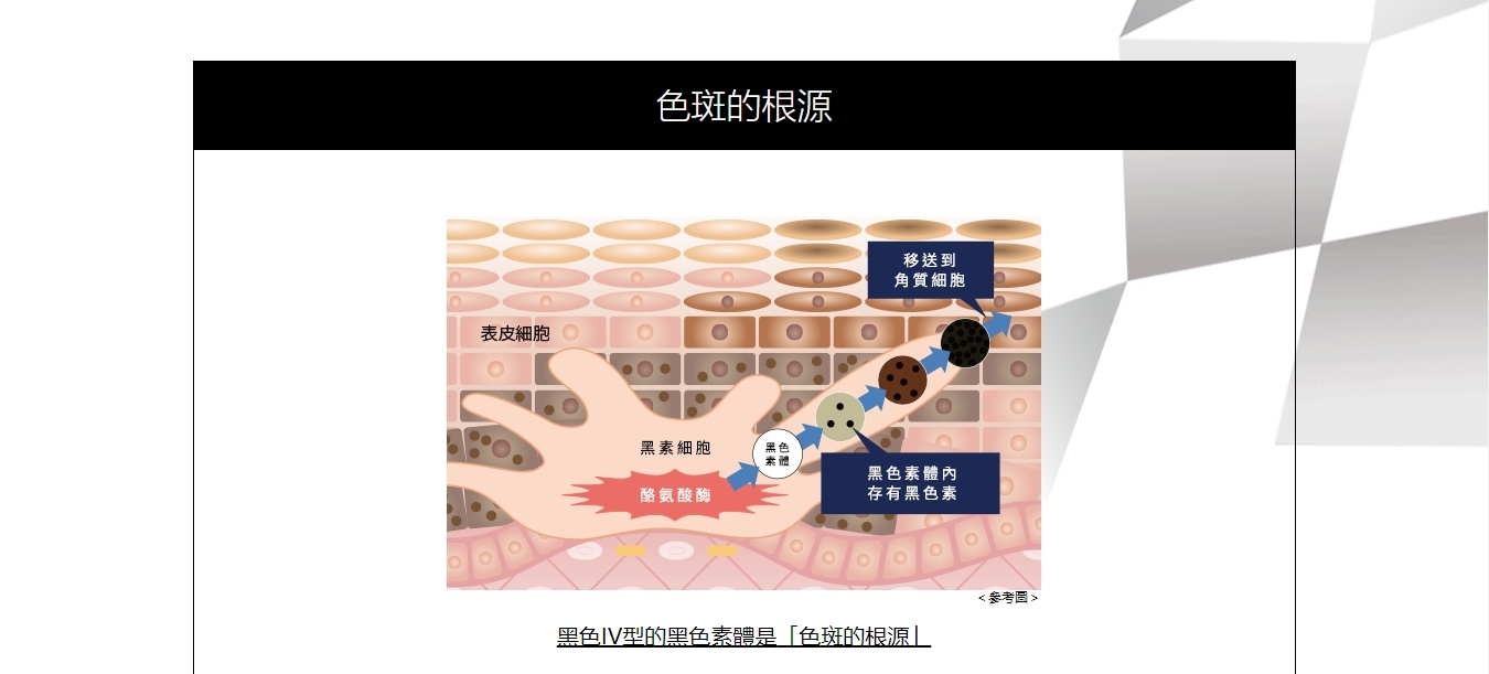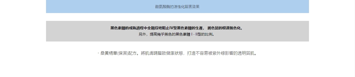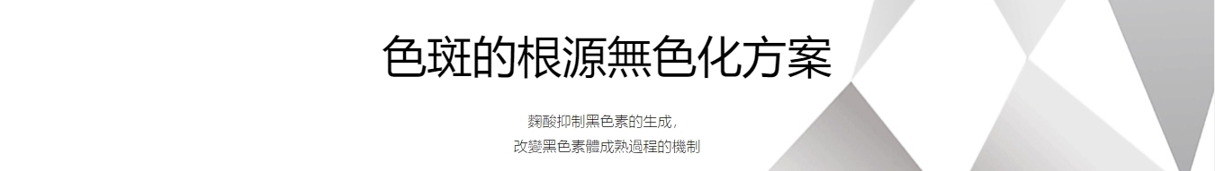 ①直接作用於色斑發生源 ②天然來源的美白有效成分 ③與其他美白有效成分相比,分子量較小 ④推薦用於鐳射去斑治療後的護理。