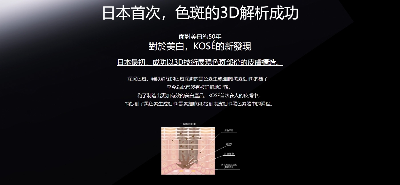 KOSE獨自的世界首創技術,對皮膚深層的色斑擴散進行立體分析。