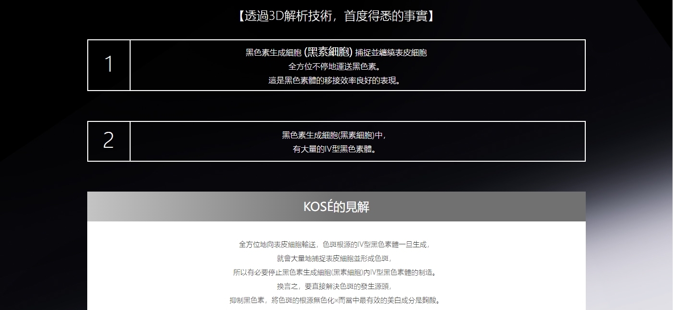 直接抑制黑色素細胞的活性,減少黑色素的生成,就能預防增多、加深的明顯"色斑"!KOSÉ 美白精華液直接作用於色斑發生源,預防未來不斷增加的色斑。