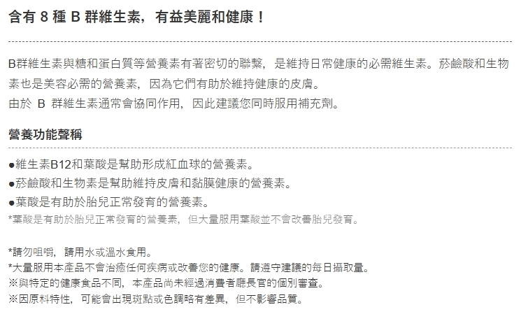 ✔ 全8種維他命B群: 維他命B1 40mg、維他命B2 30mg、維他命B6 30mg、維他命B12 20μg、