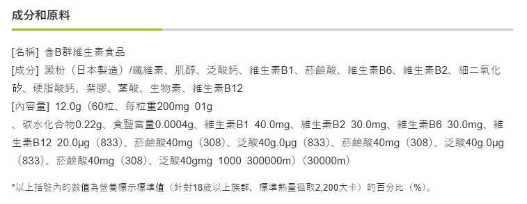 維生素B3 40mg、維生素B5 40mg、維他命B7 50μg、葉酸200μg + 肌醇50mg