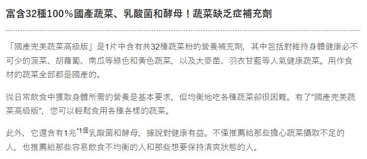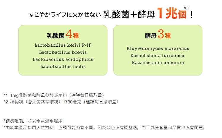 植物粉(32種*):1730mg,乳酸菌和酵母發酵殺菌粉:1mg(乳酸菌+酵母1萬億)