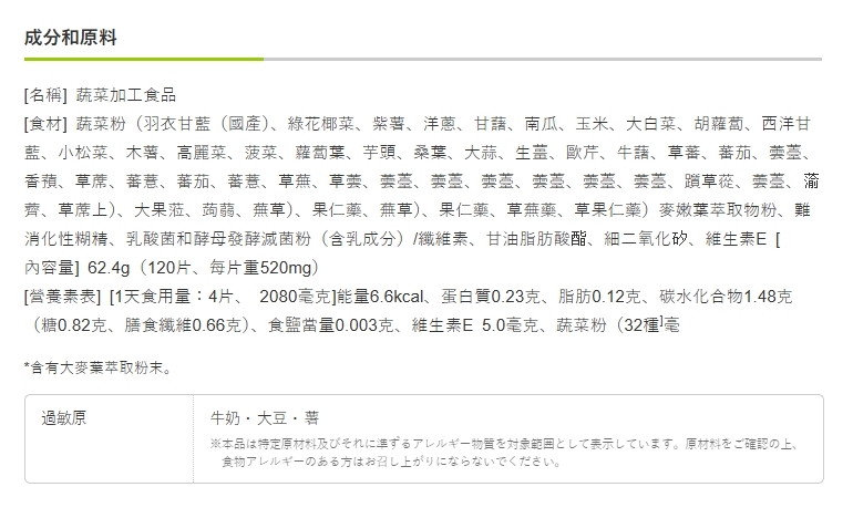 蔬菜粉(羽衣甘藍(國產)、西蘭花、紫薯、洋蔥、紅薯、南瓜、玉米、大白菜、胡蘿蔔、西門土豆、芥菜菠菜、mulukhiyah、捲心菜、菠菜、蘿蔔葉、芋頭、桑葉、大蒜、生薑、歐芹、牛蒡、芹菜、明日葉、枸杞、艾蒿、蘿蔔、蘆筍、紫蘇、毛豆(黃豆)、黃秋葵、山藥)、青稞葉提取物粉、難消化糊精、乳酸菌和酵母發酵滅菌粉(含有牛奶成分)包括)/纖維素,甘油脂肪酸酯,精細二氧化矽,維生素E