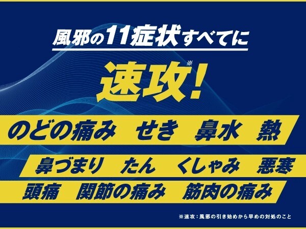 內含成份有效擊退11種感冒症狀,配合獨家技術,可瞬間釋出解熱鎮痛的有效成分,並讓人體吸收。