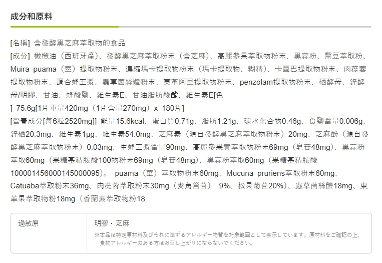 本產品除了含有「芝麻素」和「芝麻酚」兩種芝麻粉外,還添加了維生素E、蜂王乳等DHC精選的14種增強體力的成分!