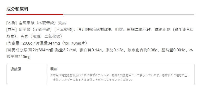 硫辛酸(α-硫辛酸) [調節劑等] 精製食用油、環糊精、抗氧化劑(提取維生素 E) 、