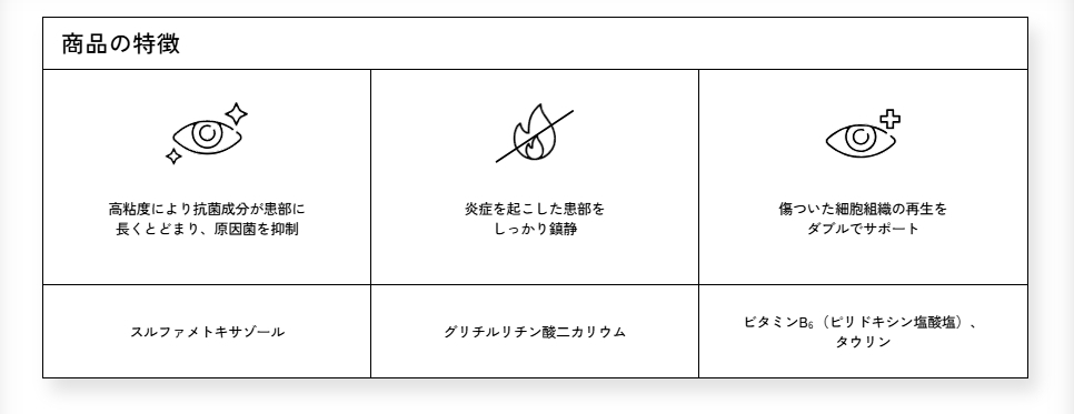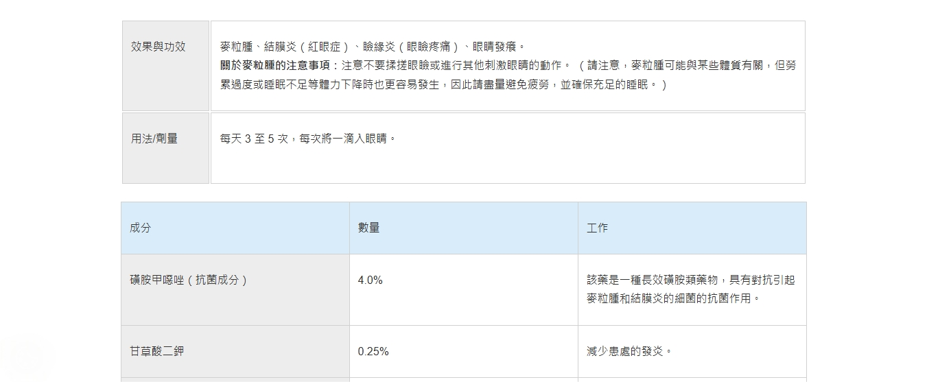 成分:磺胺甲噁唑(抗菌成分) 分量:4.0% 作用原理:一種長效磺胺類藥物,對引起麥粒腫和結膜炎的細菌具有抗菌作用。
