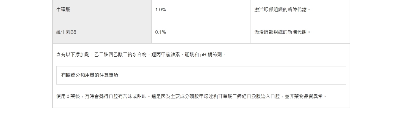 成分:牛磺酸 分量:1.0% 功能:激活眼部組織新陳代謝。