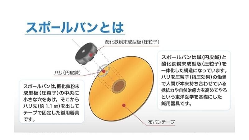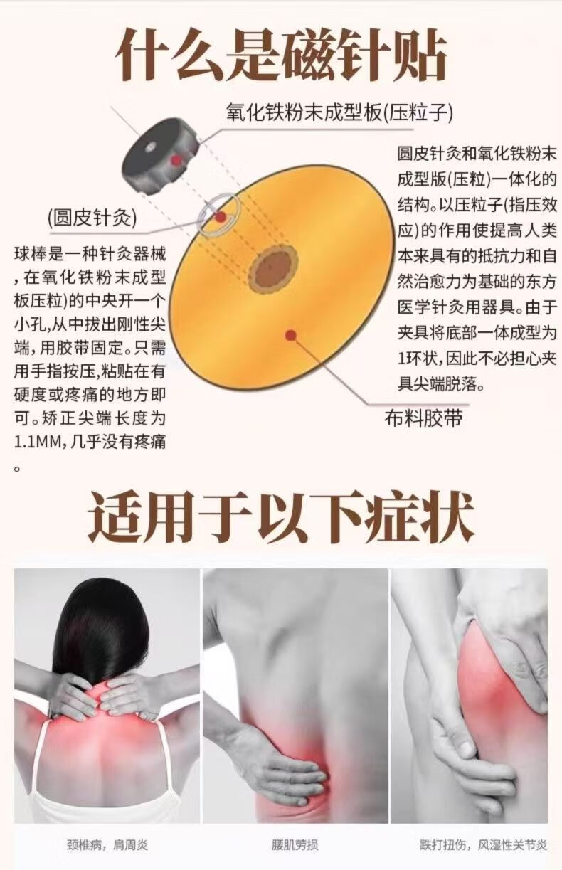 磁針貼是氧化鐵粉末成型(壓力顆粒的中央打個小洞,從那裡拿齣小針)用膠布固定的針灸設備。