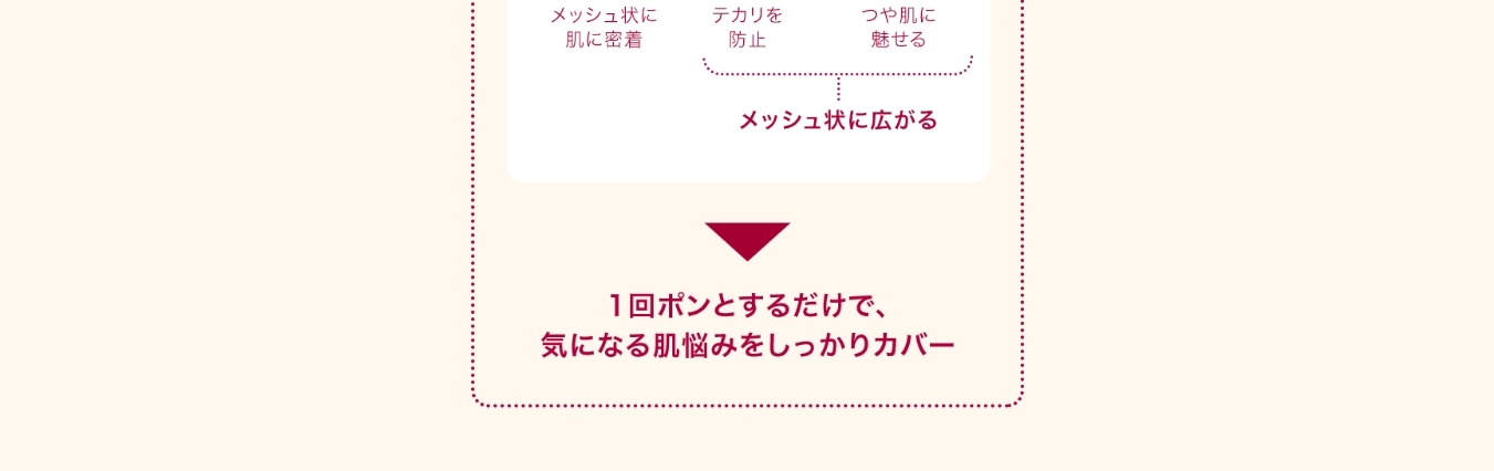 ◆ 只要將粉底塗在肌膚上一次,即刻遮蓋毛孔、膚色不均、痘印,不覺得厚重! 讓您的肌膚全天保持水潤光澤