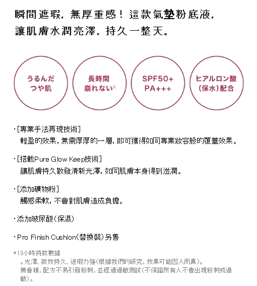 *獲得妝容持續13小時(閃亮、透薄、遮瑕)的數據(根據我們的研究,結果可能因人而異)。