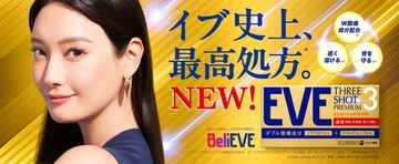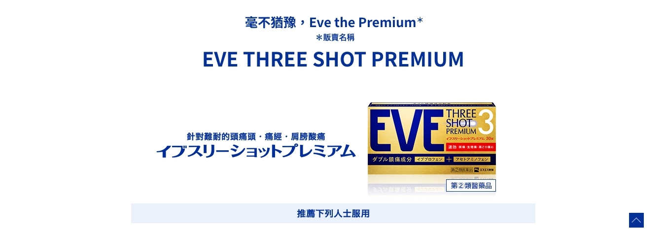 「EVE THREE SHOT PREMIUM」是EVE歷史上最強配方的鎮痛藥,專門針對日本女性常見的三大疼痛問題*2(頭痛、經痛、肩膀痠痛)。