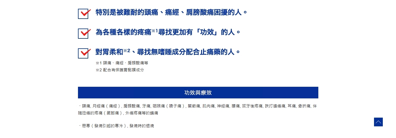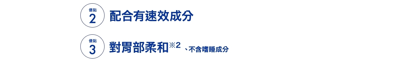 3. 保護胃部:含有保護胃部的成份,即使效果強、作用快速,也能同時保護胃部。且不含使人嗜睡的成分,無論在工作中或其他場合,都可以安心服用。