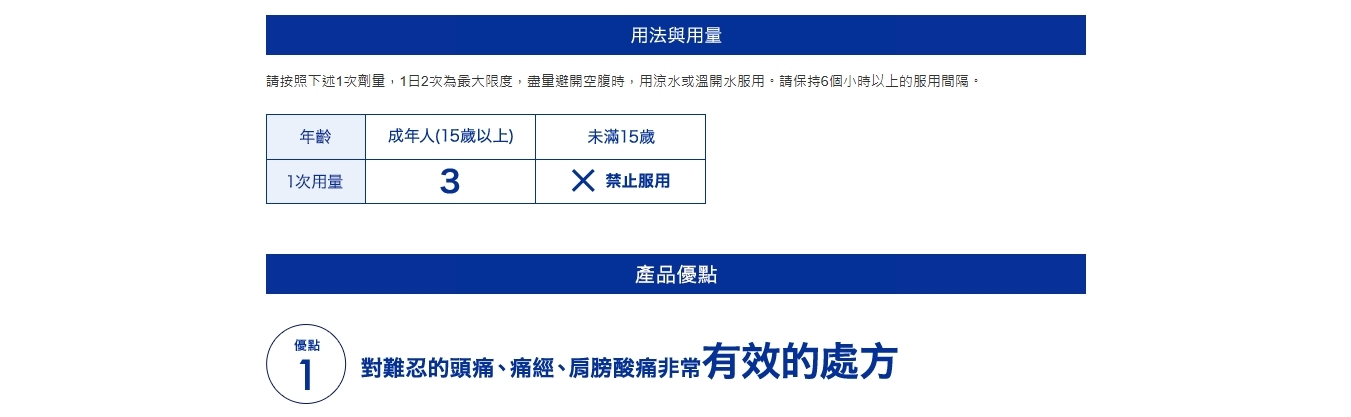 功效: 用於緩解頭痛、月經痛(經痛)、肩膀疼痛、牙痛、喉嚨痛、關節痛、肌肉痛、神經痛、腰痛、
