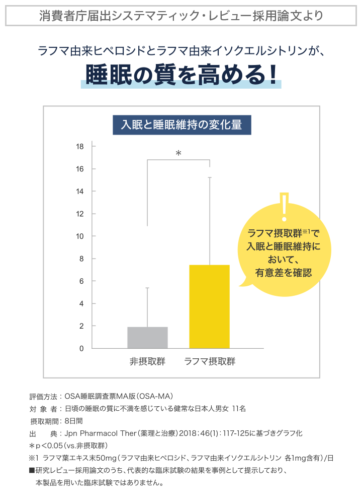 據研究,從拉夫馬中提取的金絲桃苷和異槲皮苷可改善睡眠品質(睡眠深度和醒來後的睡眠滿意度)。