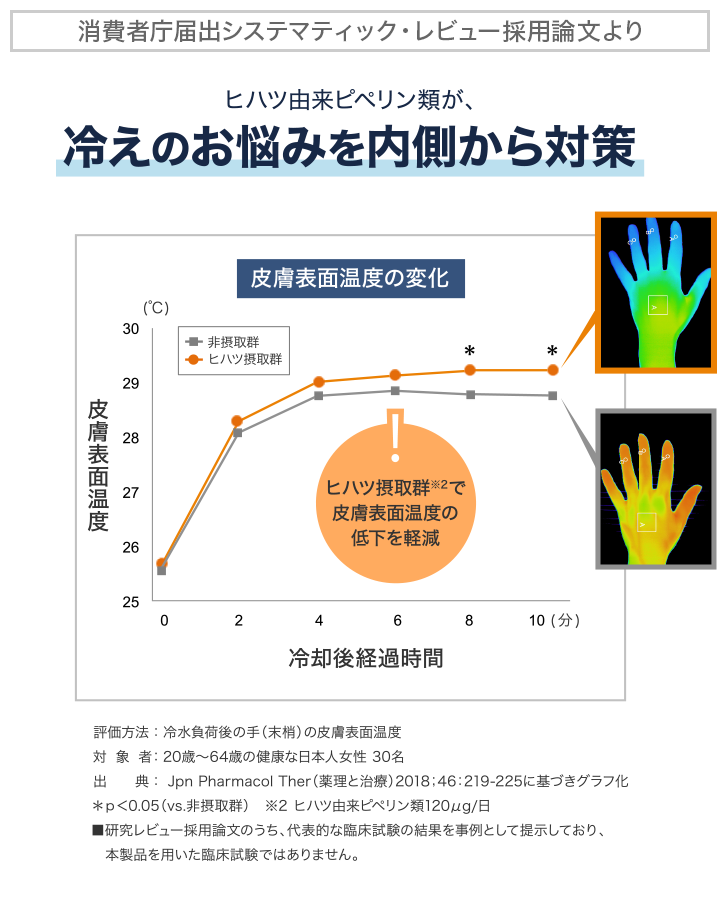 源自蓽茇的胡椒鹼可使因寒冷而減少的周邊血流量恢復正常,並減輕因寒冷引起的周邊(手部)體溫(皮膚表面溫度)的下降。