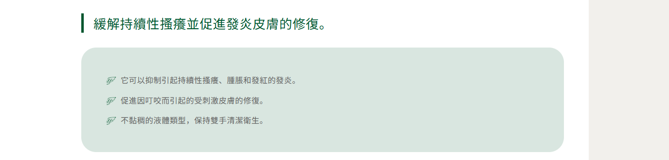 緩解頑固癢感:能迅速緩解持續的癢感和腫脹,讓您恢復舒適。