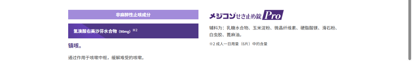 它含有氫溴酸右美沙芬水合物,劑量與醫用制劑相同,具有出色的鎮咳效果。