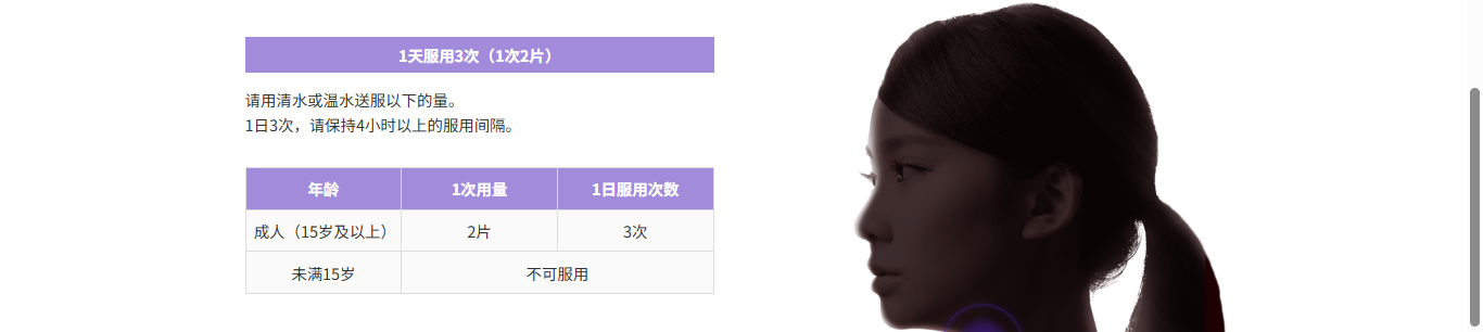 成人(15歲以上):每次2片,每日3次,使用時請用水或溫水送服。