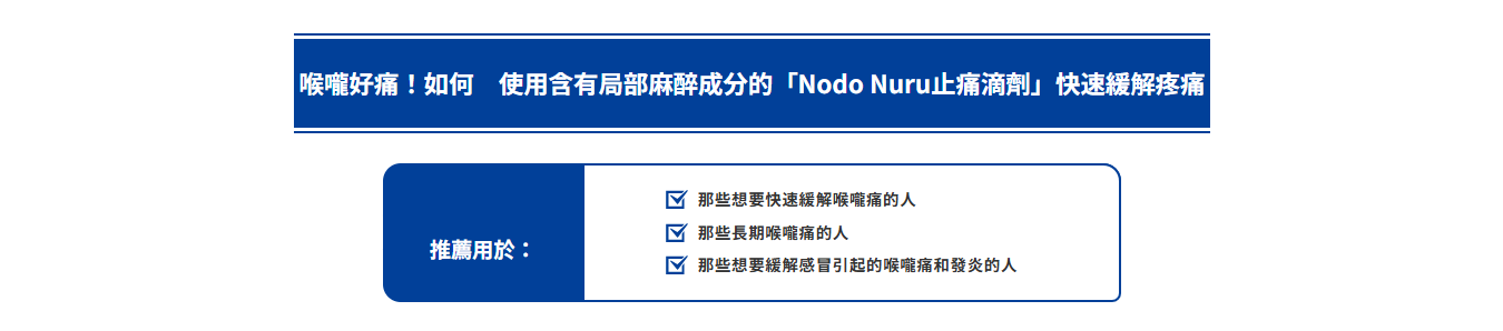 緩解因喉嚨發炎引起的:喉嚨痛、喉嚨腫脹、聲音沙啞、喉嚨乾燥粗糙、口腔內的殺菌與消毒