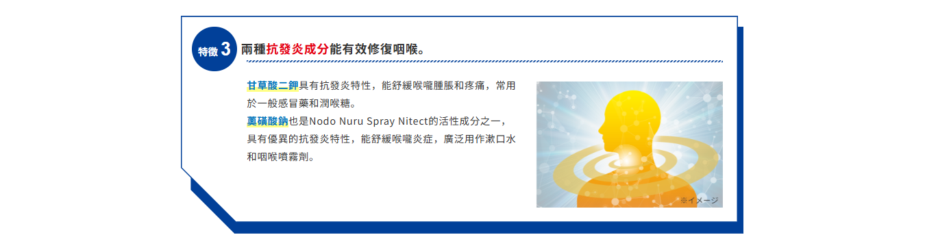 抗炎成分「藍劑磺酸鈉」能修復受損喉嚨黏膜。