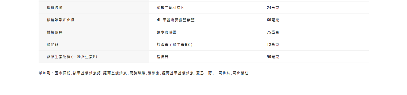 緩解咳嗽和痰:dl-甲基麻黃鹼鹽酸鹽(dl-Methyl Ephedrine Hydrochloride):60毫克