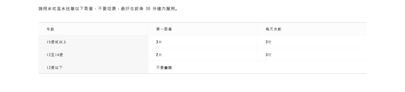 12歲〜14歲:每次 2錠 、每日3次