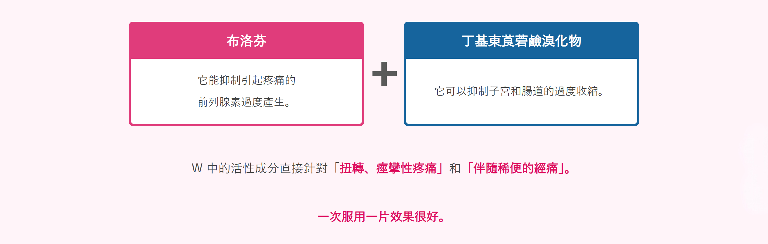 這兩種活性成分直接針對「扭轉、痙攣性疼痛」和「伴隨稀便的經痛」。