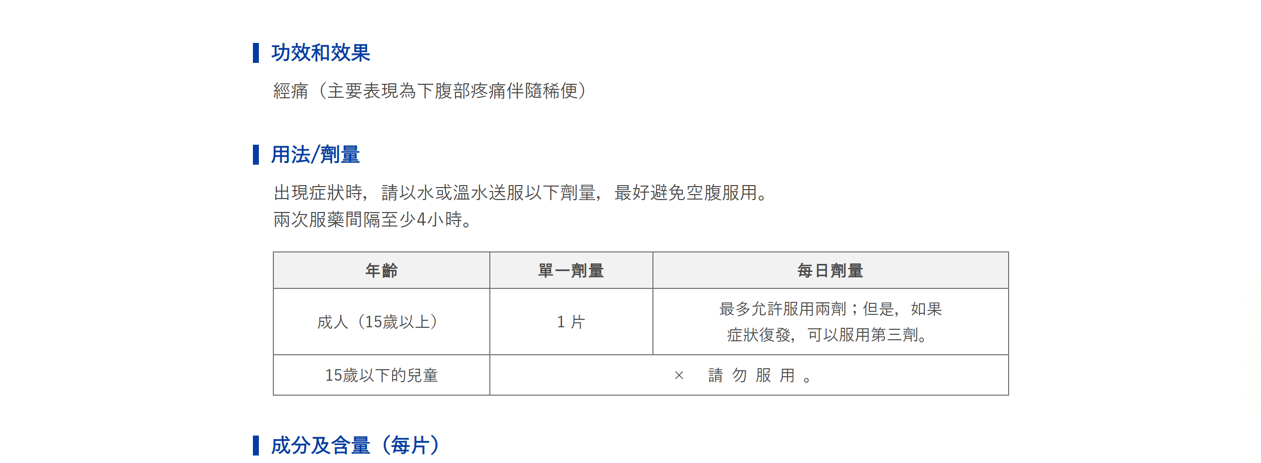 兩種活性成分能有效緩解「扭轉、痙攣性疼痛」和「伴隨腹瀉的經痛」。