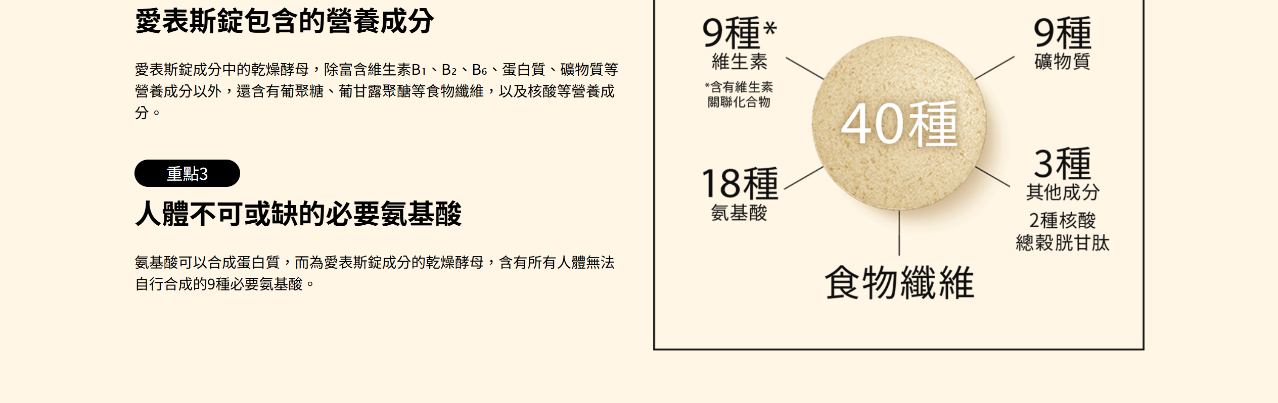 愛表斯錠成分中乾燥酵母(將啤酒酵母精製、乾燥後之產物)含有的40種營養成分,
