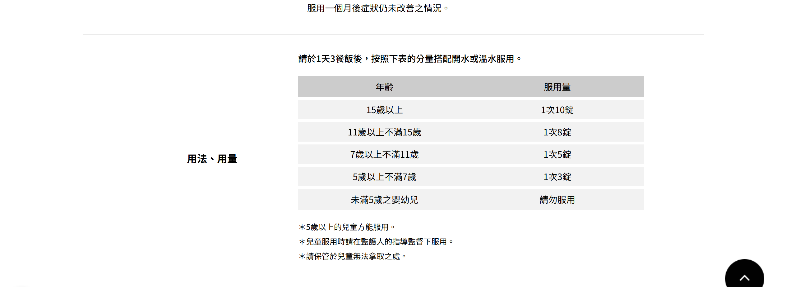 請於1天3餐飯後,按照下表的分量搭配開水或溫水服用。
