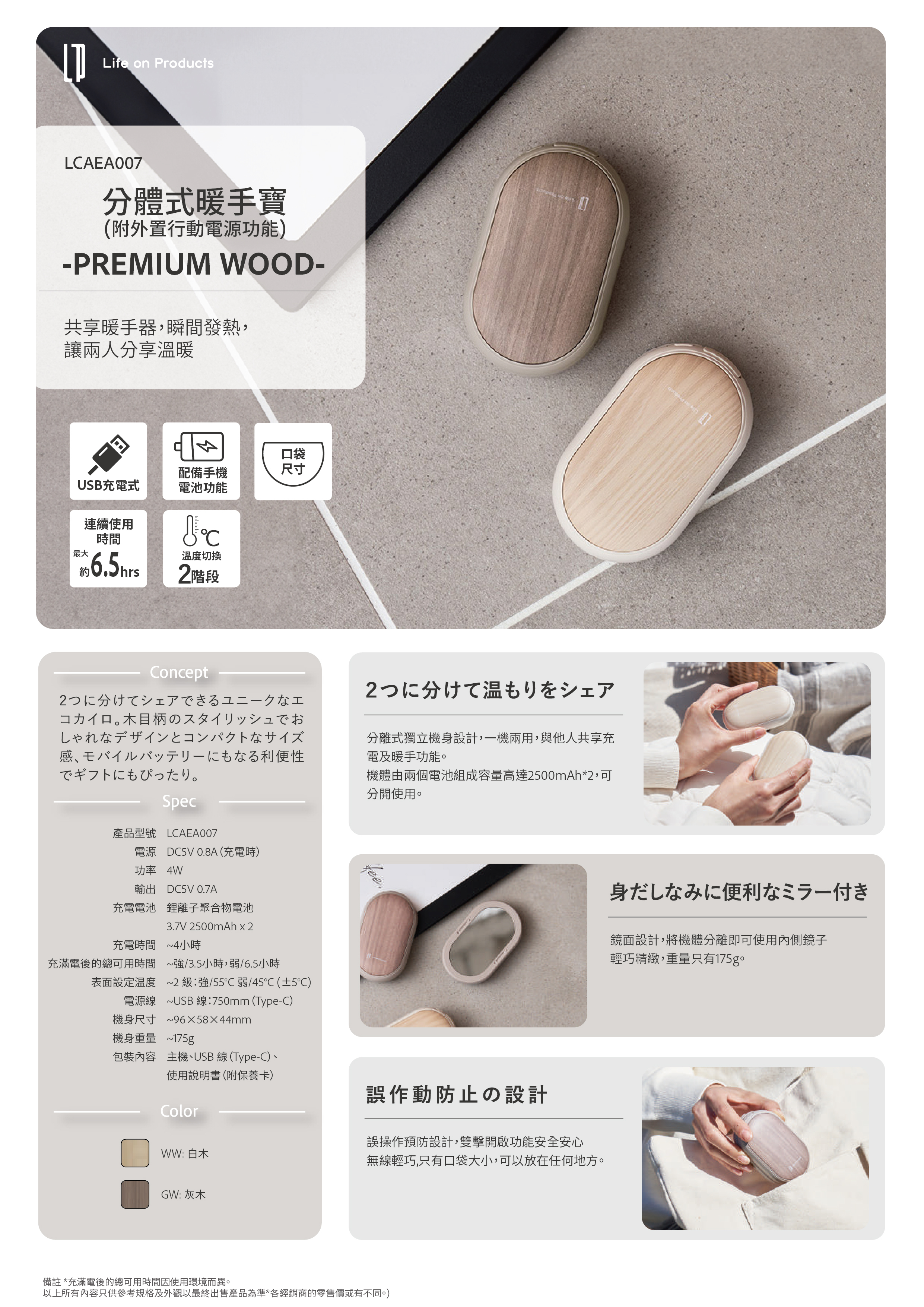 產品獨特的木紋圖案及鏡面設計,機身可分為兩邊獨立使用,除暖手寶功能,
