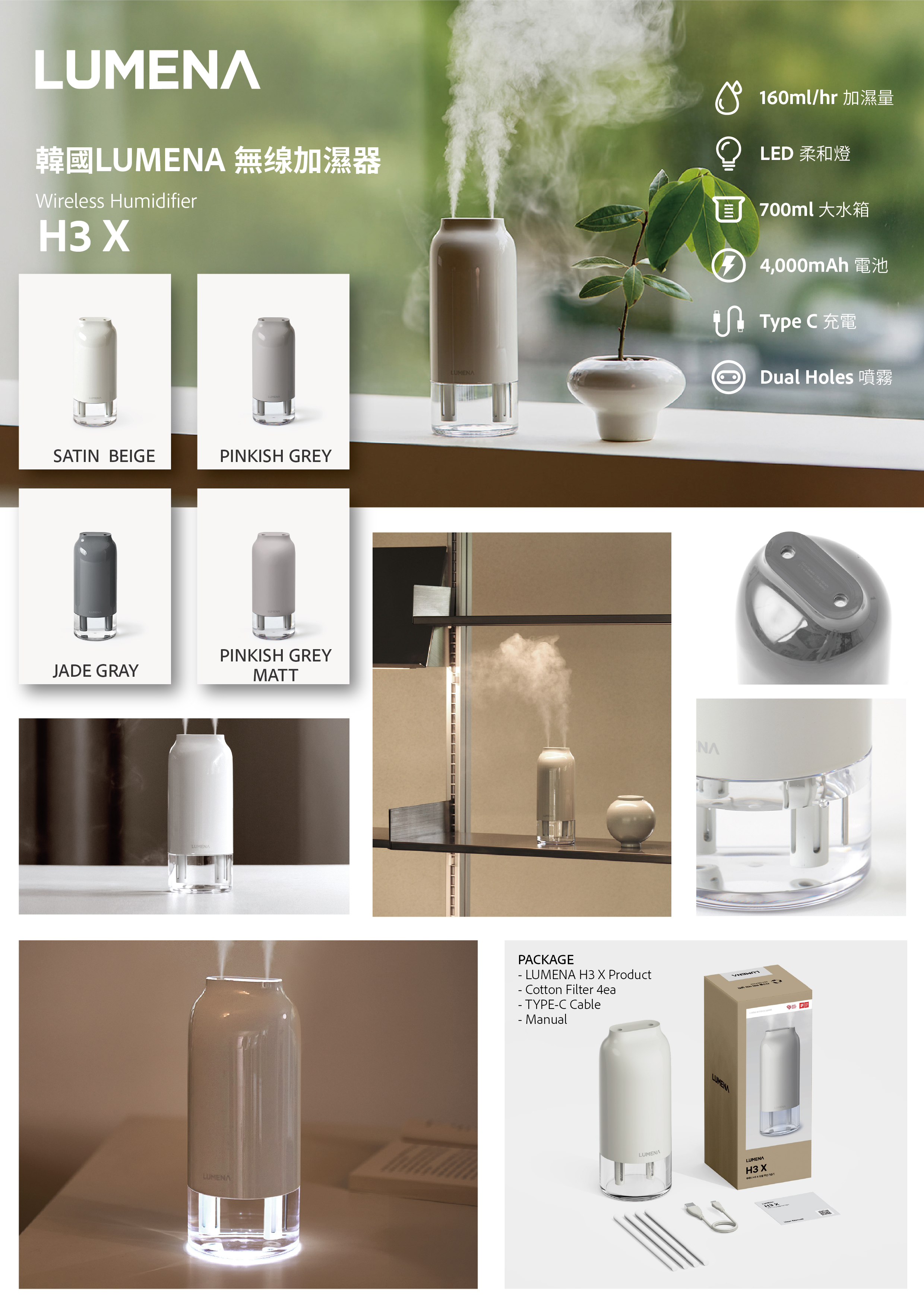 LUMENA 無線加濕機 H3X,最新推出新的仿陶瓷油漆的H3X, 型格設計,雙孔加濕出水霧量大,內置電池,可放屋企或office 用,秋冬天必備的加濕機。
