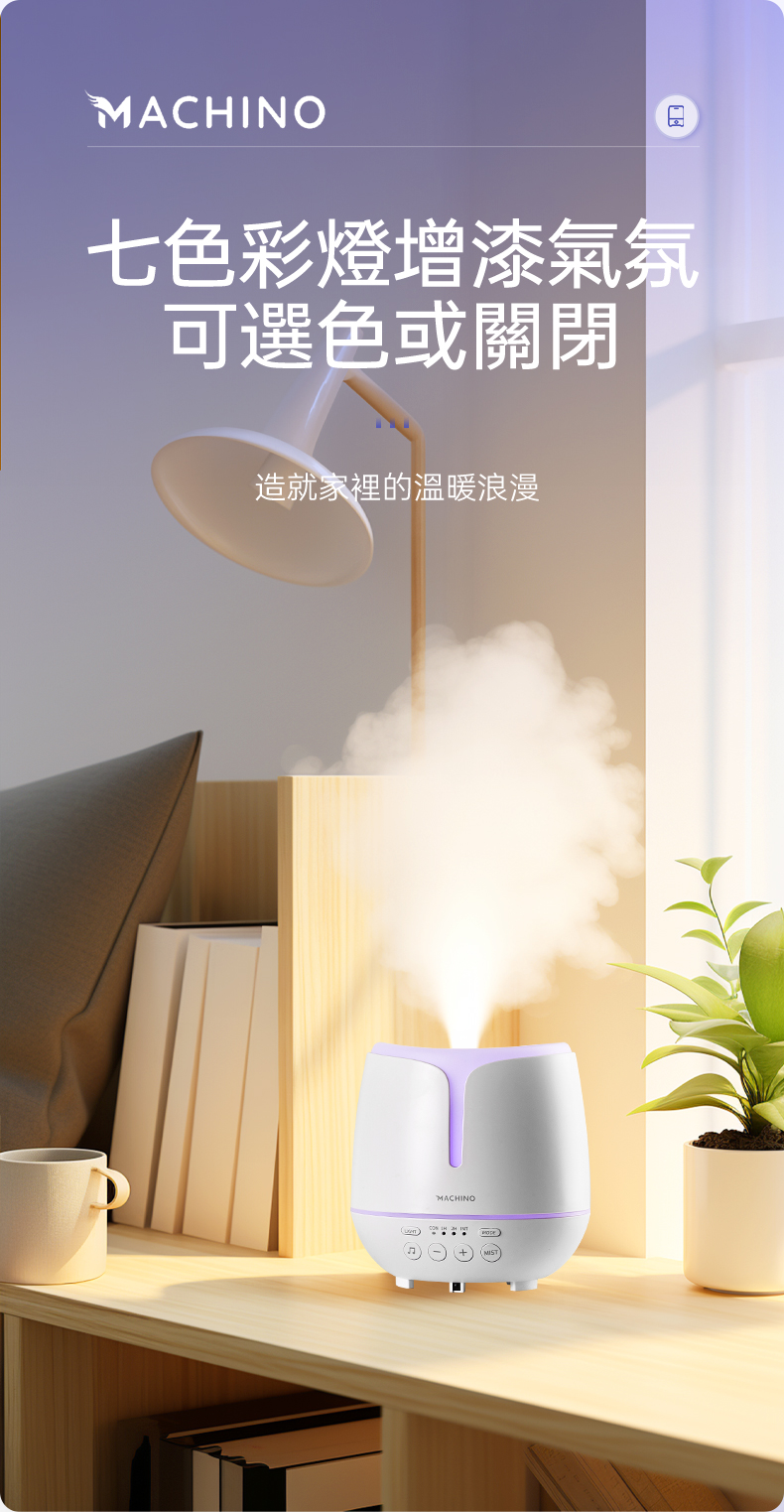 - 集合七色小夜燈+霧氣,增添氣氛,柔和水霧,舒緩乾燥不適