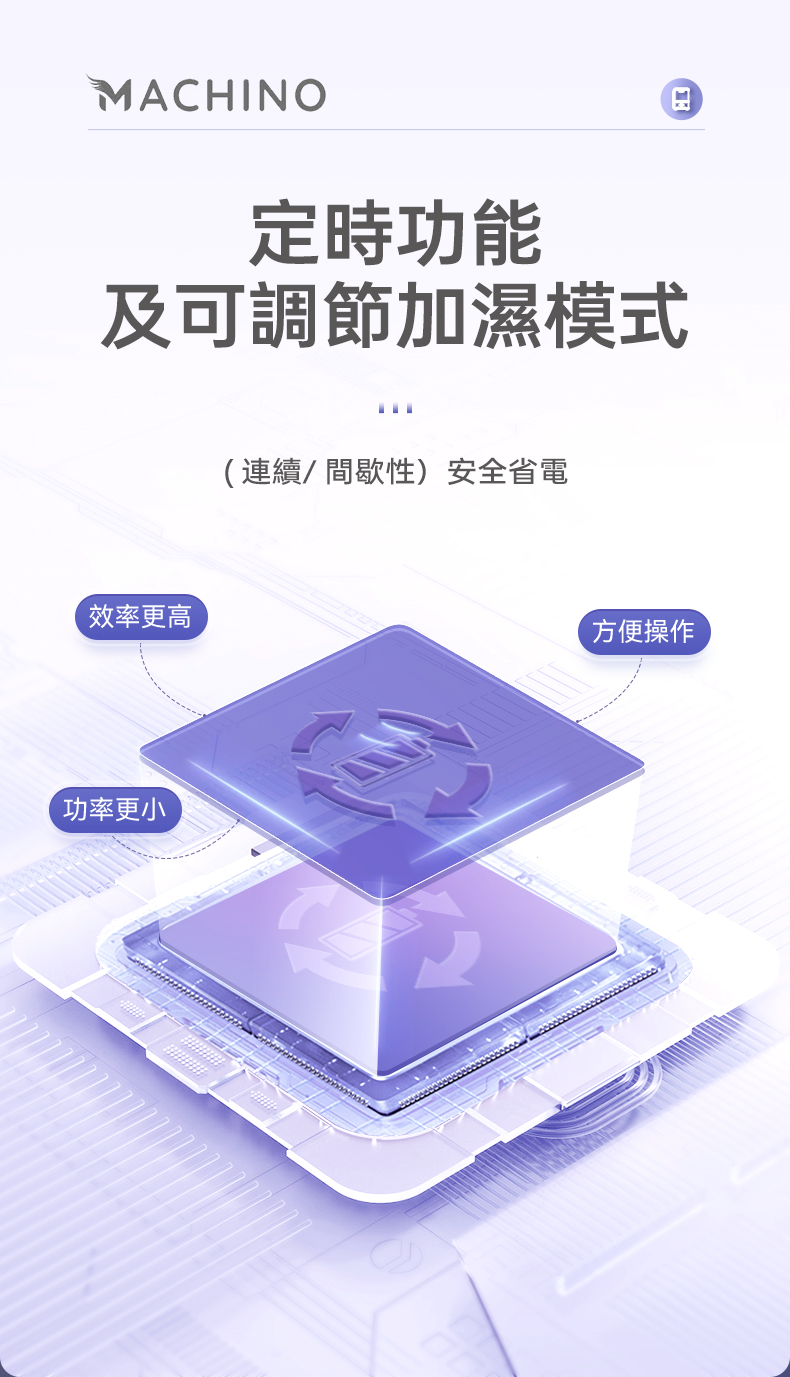 - 設有定時功能及可調節加濕模式( 連續/ 間歇性),安全省電