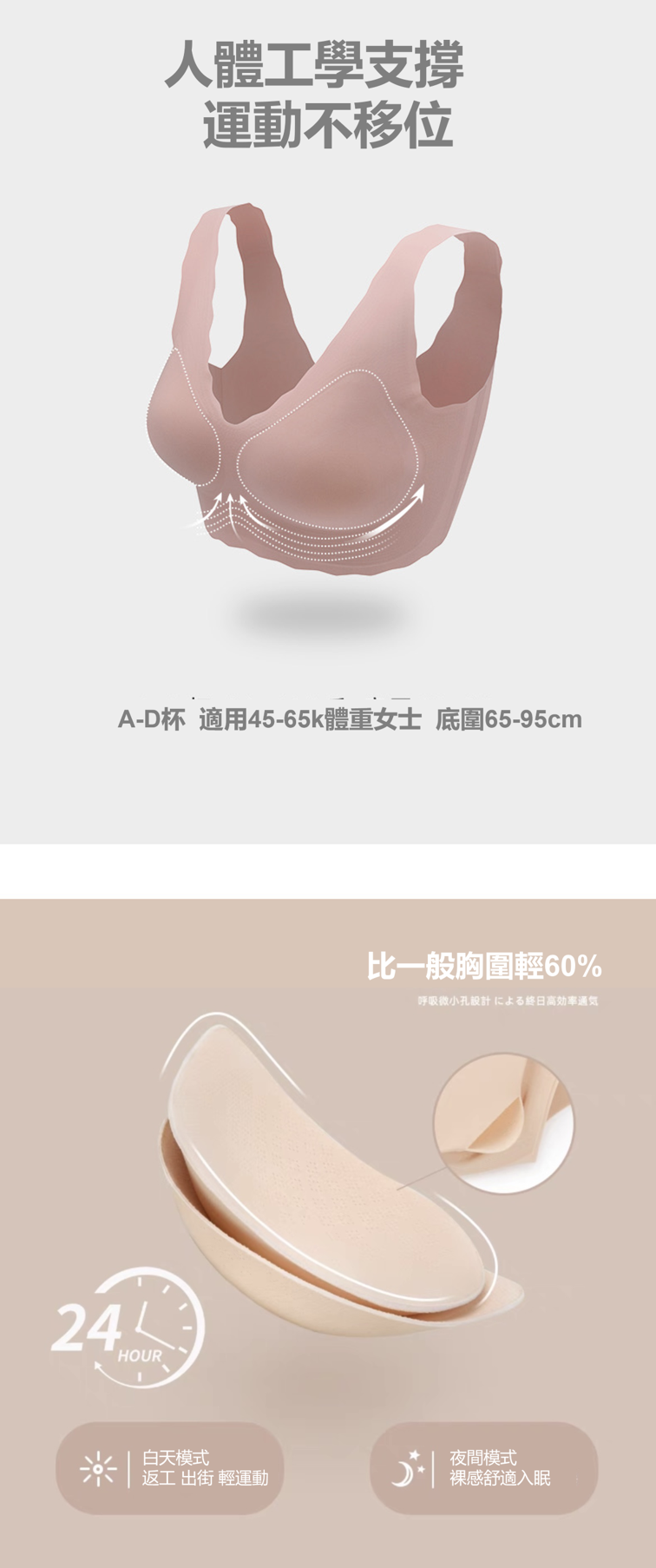 全新科技親膚面料,輕薄透氣,儘56g輕如雲,記憶科技底部不移位,穩定不跌膊,絲滑質地如羽毛般的超輕柔觸感貼身呵護,零肌感「著完似冇著」